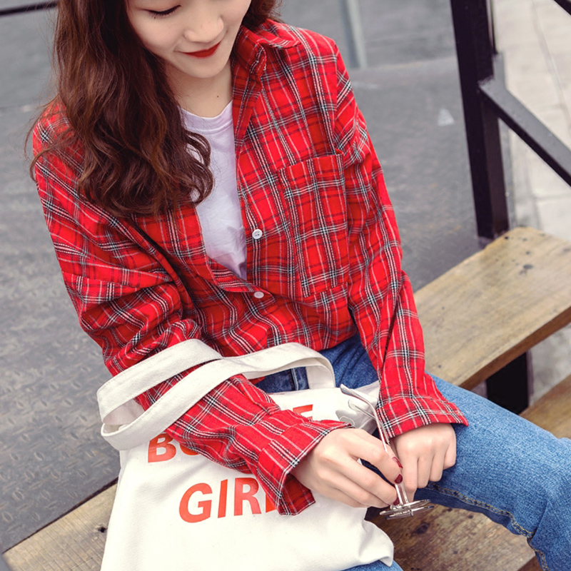 / 春裝新款女襯衫韓版寬松休閑學生長袖格子開衫襯衣上衣外套潮