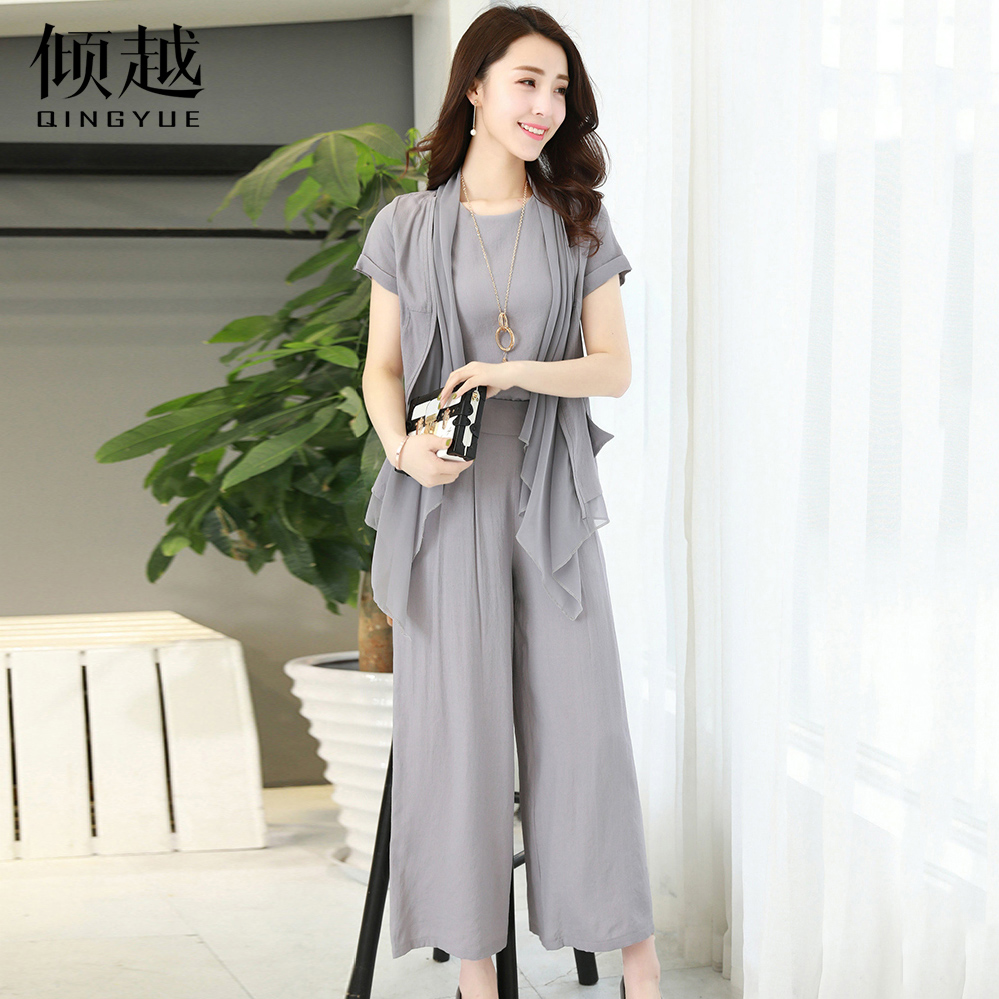 傾越套裝女2017夏裝新款韓版修身短袖雪紡百搭三件套九分褲闊腿褲