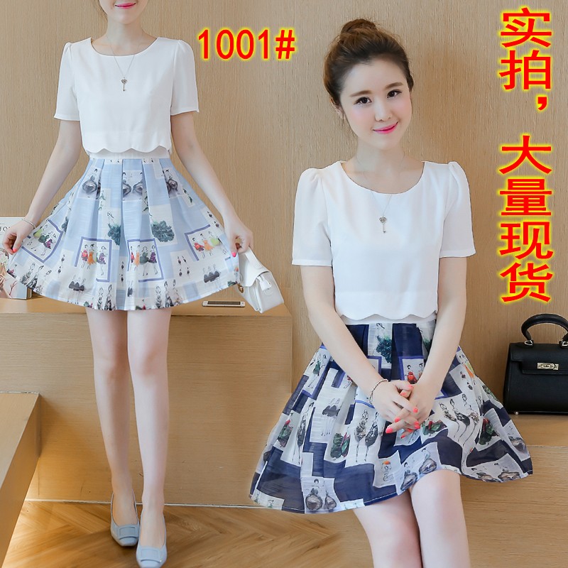 / 夏裝新款韓版女裝A字裙假兩件短袖印花雪紡連衣裙修身中裙女