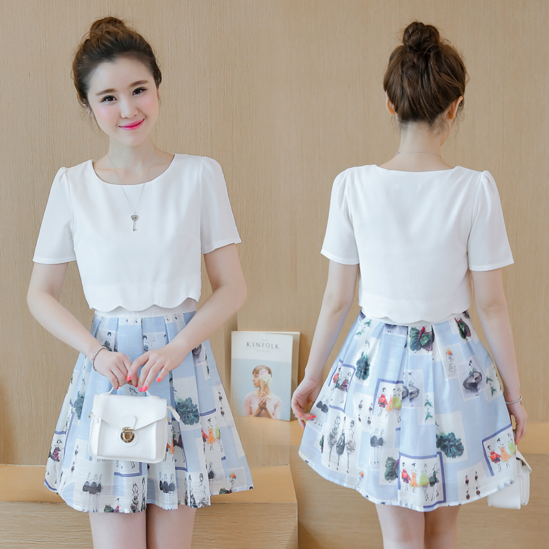 夏裝新款韓版女裝A字裙假兩件短袖印花雪紡連衣裙修身中裙女