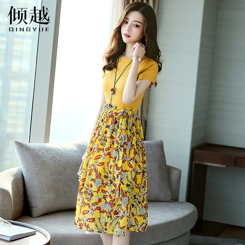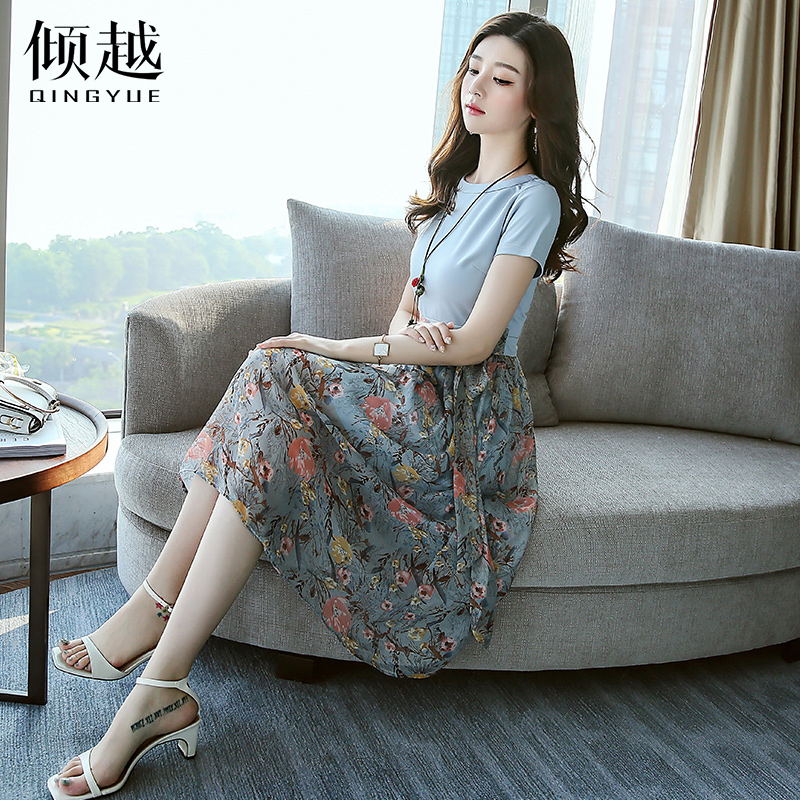 雪紡連衣裙2017夏季新款韓版女修身顯瘦中長款時尚印花短袖裙子潮