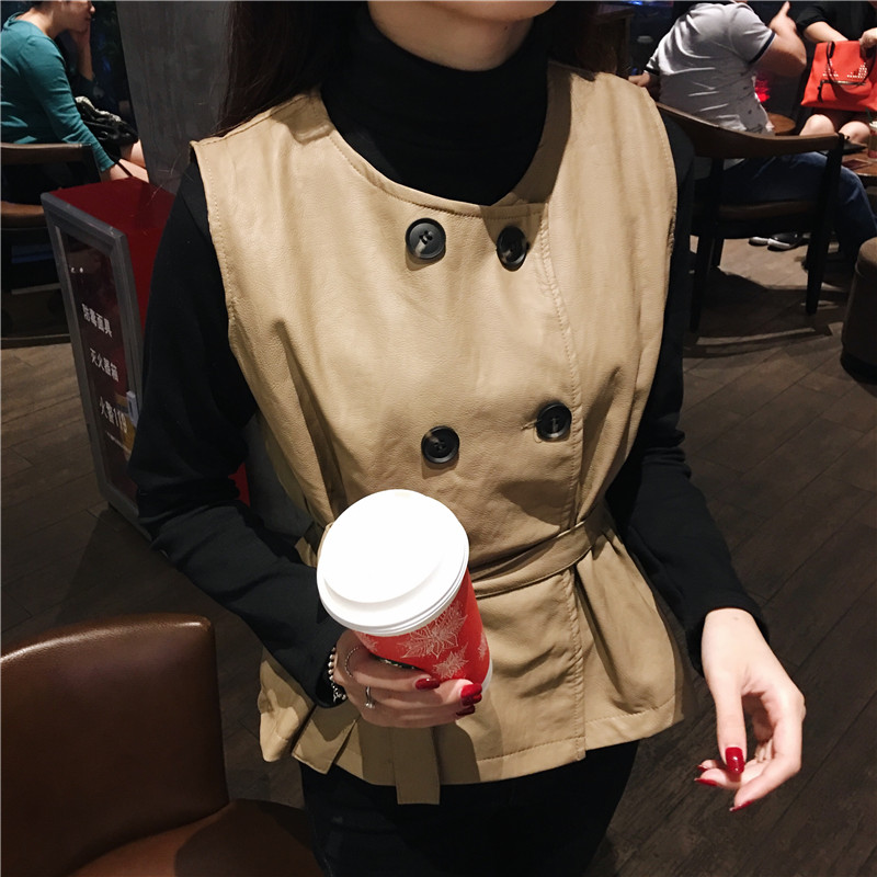 秋冬款韓國chic四粒扣pu皮馬甲小背心+加厚高領打底衫套裝女