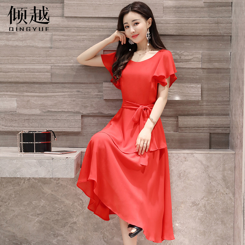 / 夏季新款女裝2017韓版顯瘦高腰大碼氣質修身雪紡連衣裙過膝長裙女