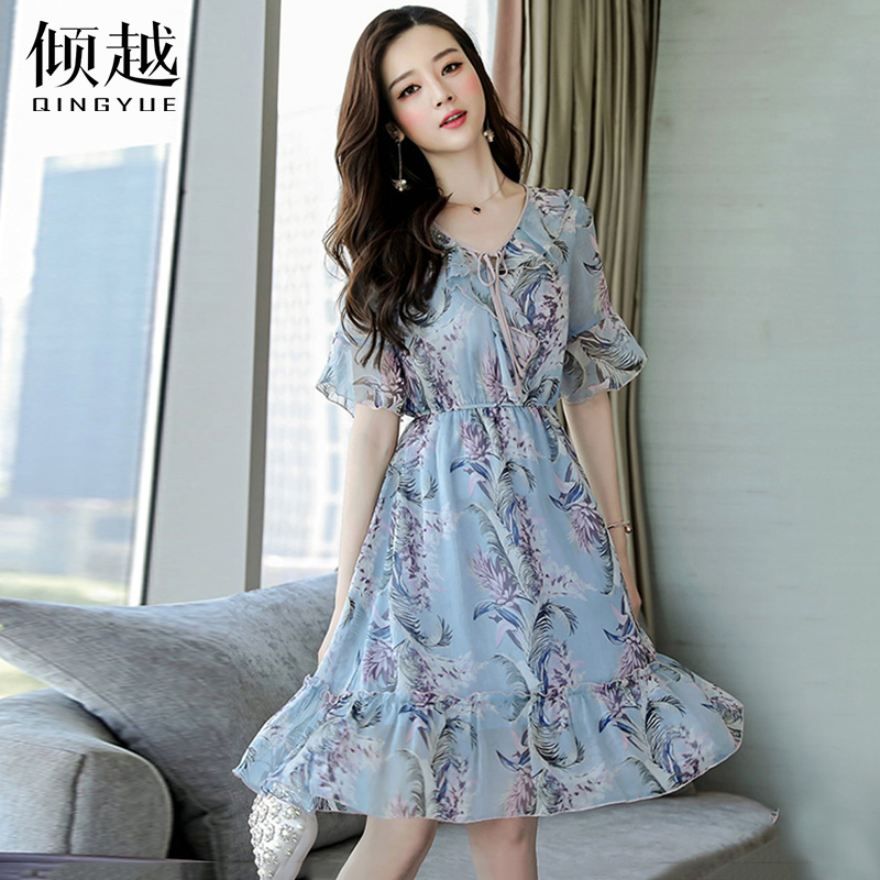 2017碎花雪紡連衣裙女夏裝新款氣質韓國v領喇叭袖荷葉邊裙子顯瘦