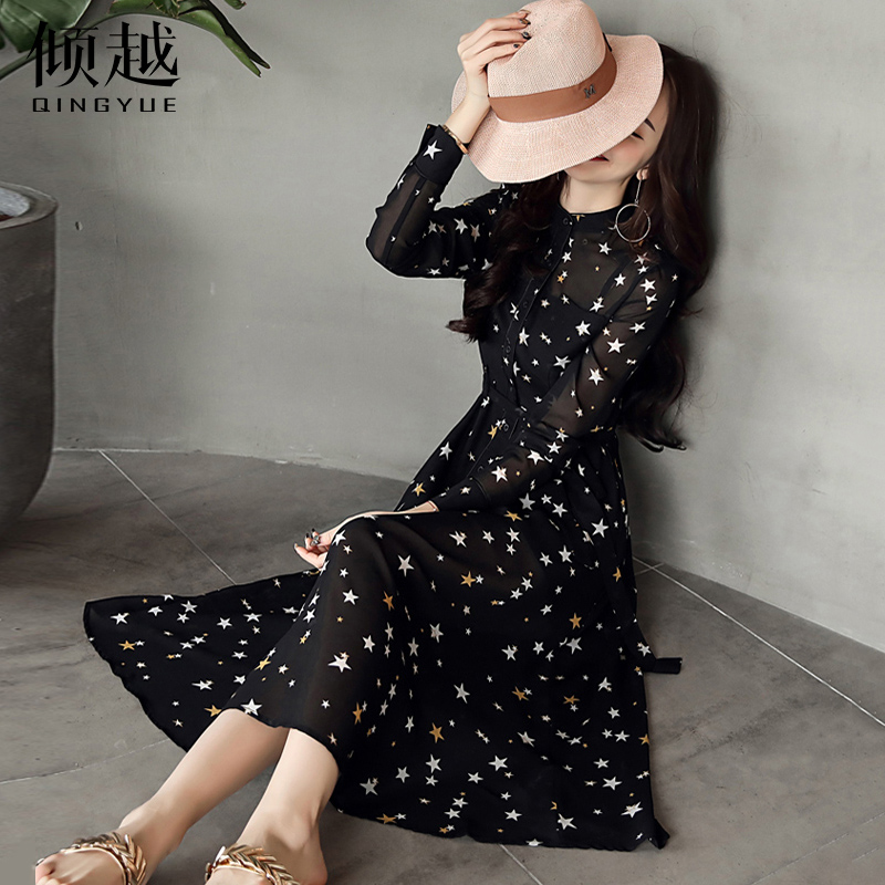 / 傾越2017春裝新款潮雪紡連衣裙女韓版修身中長款兩件套打底裙夏季