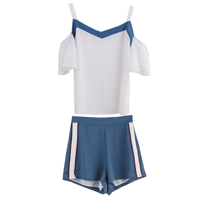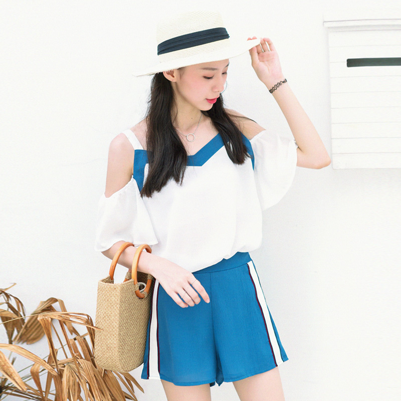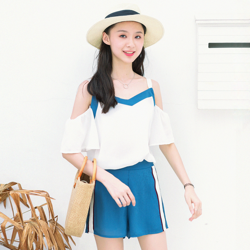 吊帶露肩雪紡衫+短褲兩件套,簡單干凈大方的feel~