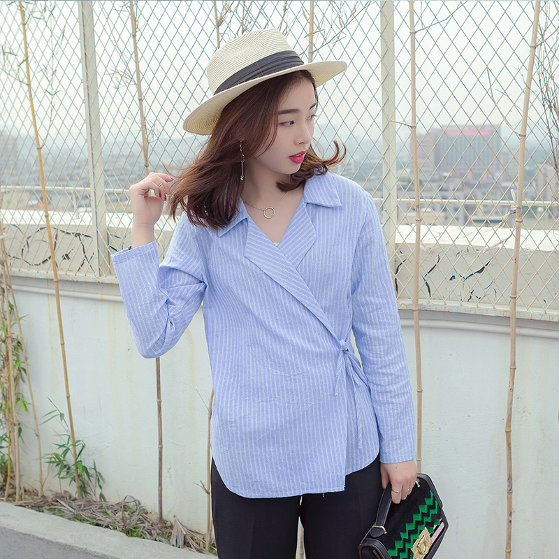 春裝女裝新款韓版豎條紋V領襯衫腰部系帶顯瘦襯衣學生上衣潮