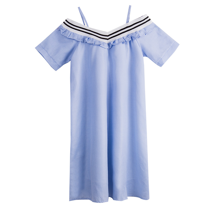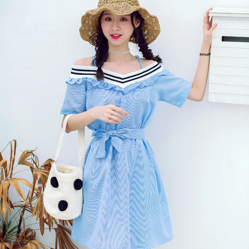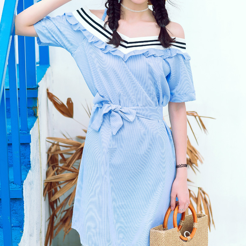 / 夏裝韓版新款女裝一字領露肩連衣裙時尚條紋系帶小清新裙子潮