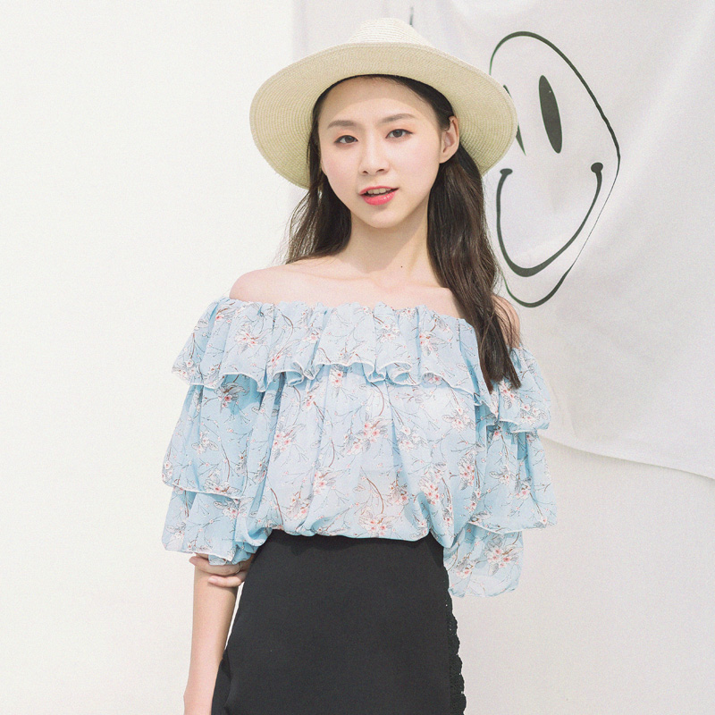 夏裝新款女裝韓版一字領露肩雪紡衫寬松顯瘦荷葉邊短袖上衣潮