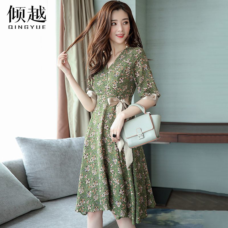 碎花裙子夏季新款2017顯瘦韓版中長款收腰v領印花短袖雪紡連衣裙