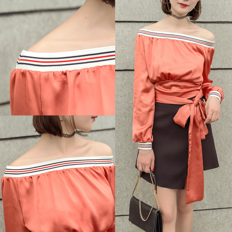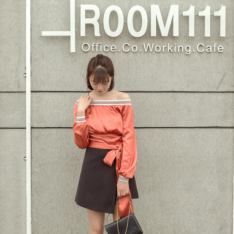 領口拼接撞色松緊條帶,可以斜肩/一字肩 下擺收腰處理,