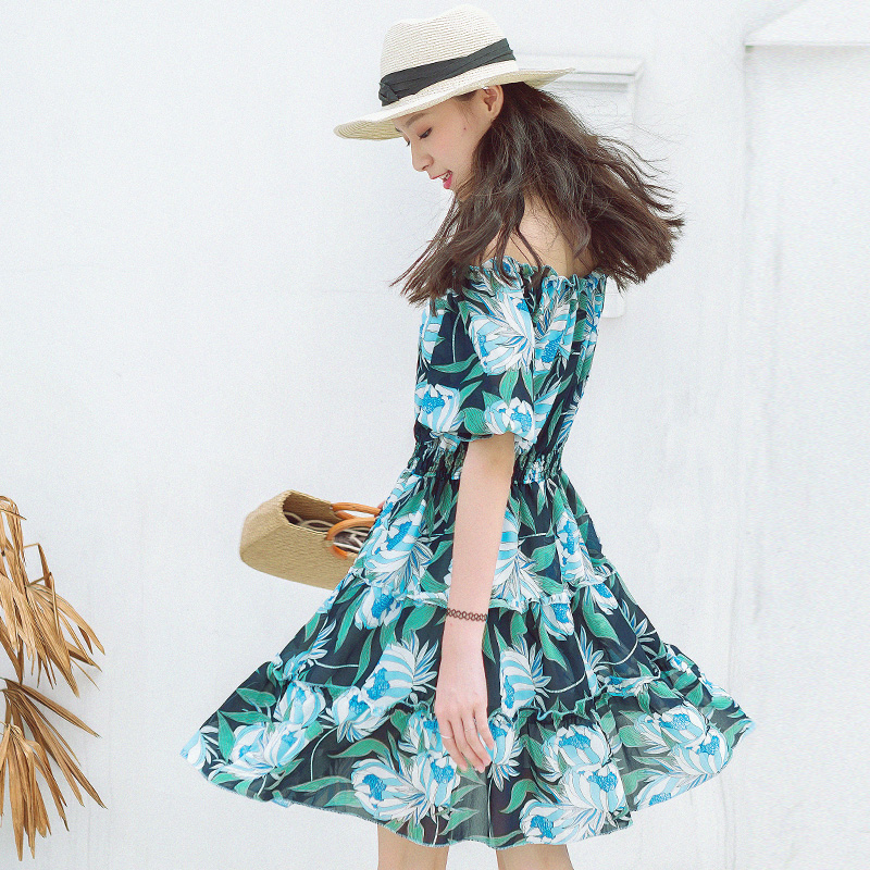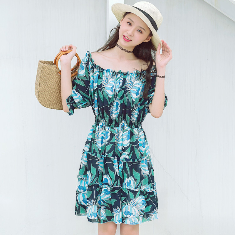 / 夏裝新款韓版女裝復古印花連衣裙收腰顯瘦一字肩露肩裙子女潮
