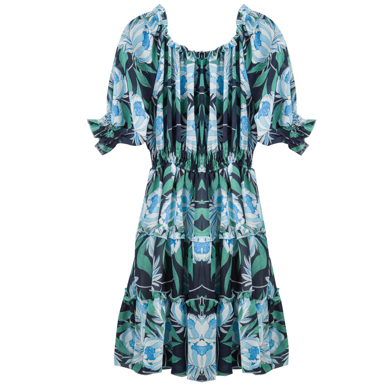 夏裝新款韓版女裝復古印花連衣裙收腰顯瘦一字肩露肩裙子女潮