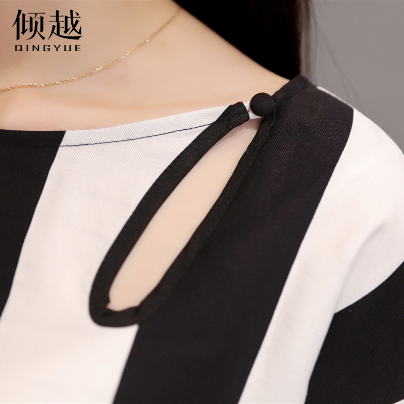 傾越2017夏季女裝新款韓版修身連衣裙百搭條紋短袖連衣裙女收腰潮