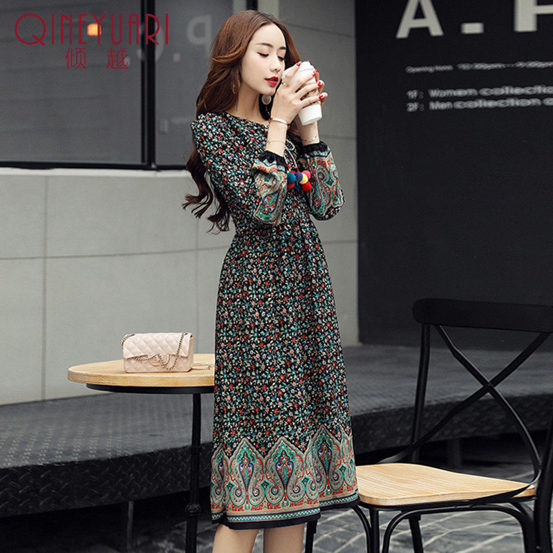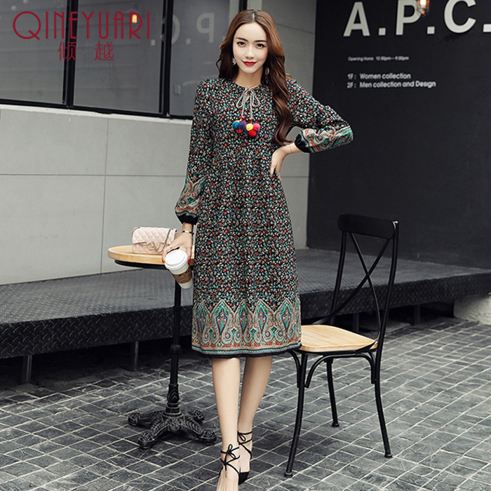/ 傾越2017春季新款修身小碎花色雪紡連衣裙女裝長袖中長款打底裙子