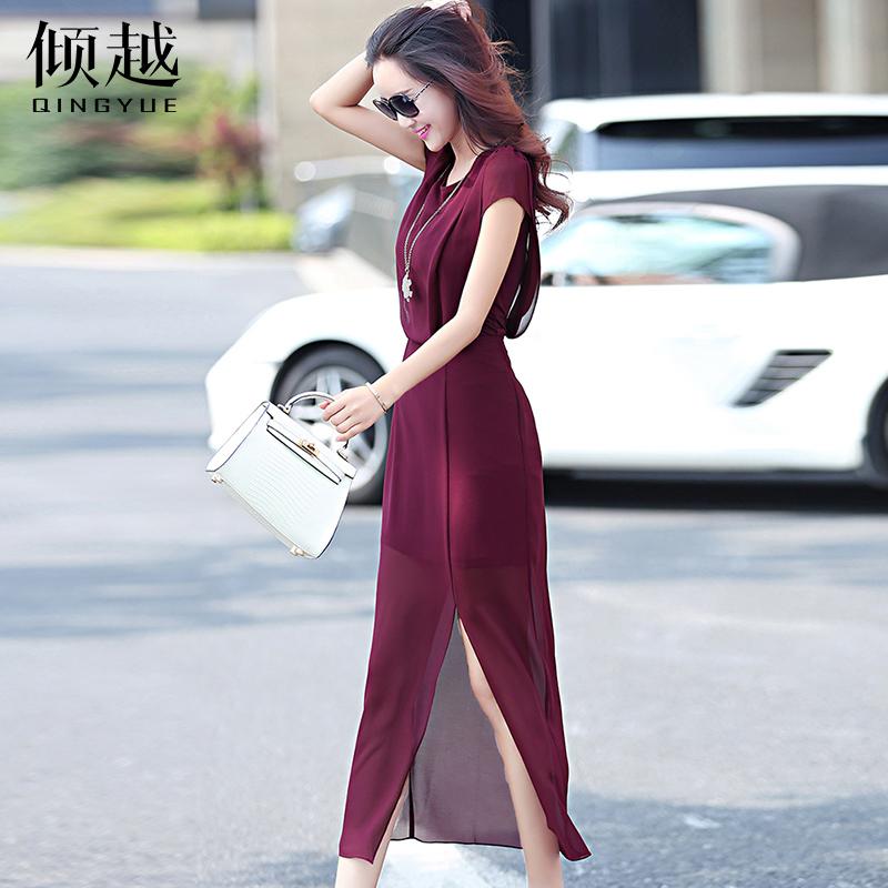 傾越雪紡長裙修身短袖2017夏裝新款女士長款包臀連衣裙開叉一步裙
