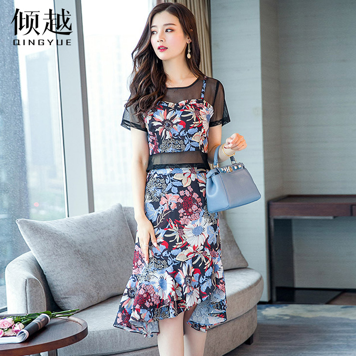 套裝裙女2017夏季新款短袖網紗拼接碎花雪紡包臀魚尾半身裙兩件套