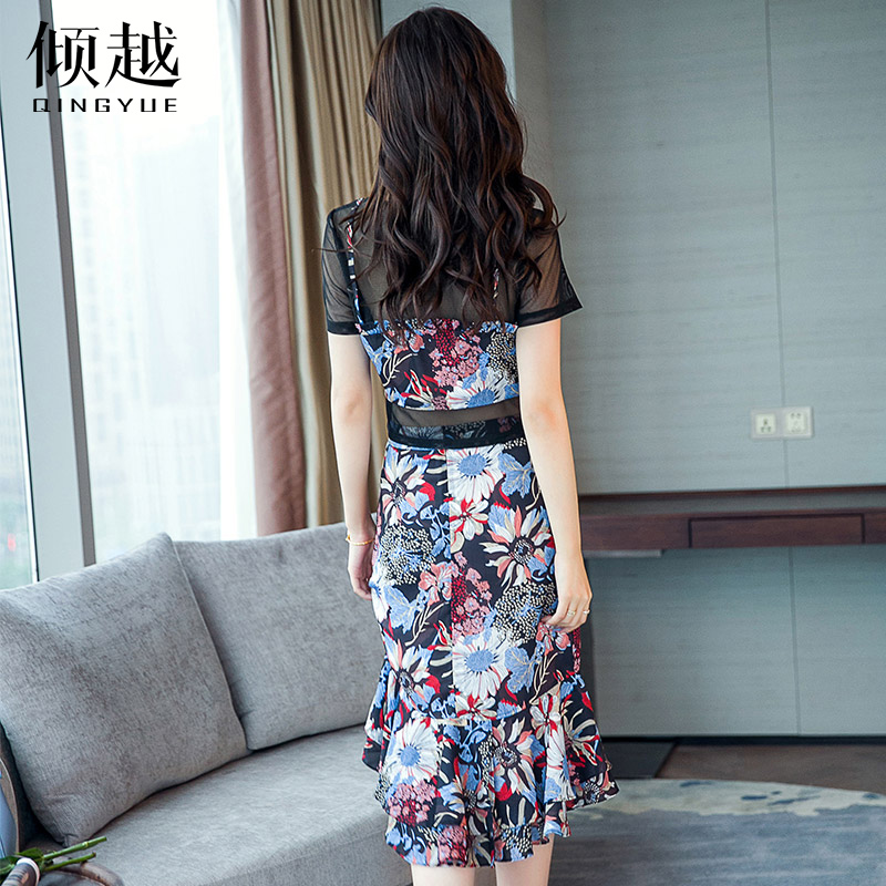 / 套裝裙女2017夏季新款短袖網紗拼接碎花雪紡包臀魚尾半身裙兩件套
