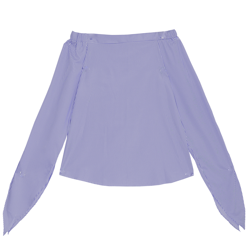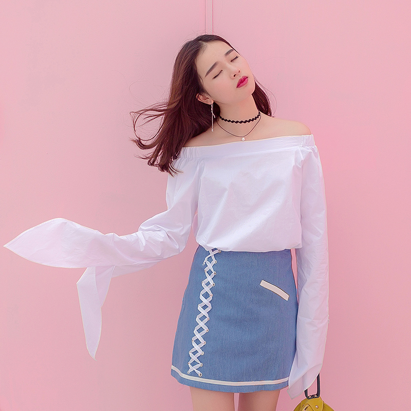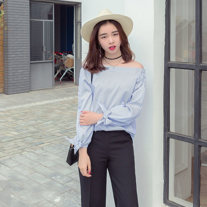 / 春裝新款時尚條紋襯衫女一字領露肩喇叭長袖韓范百搭襯衣上衣
