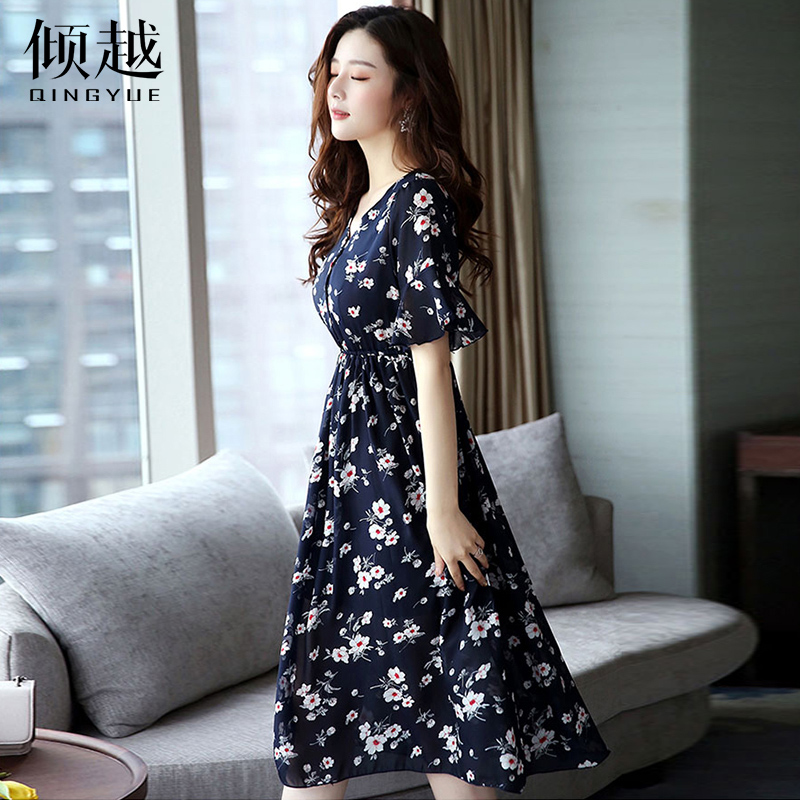 / 2017夏季新款韓版女裝小清新雪紡連衣裙子中長款碎花顯瘦短袖收腰