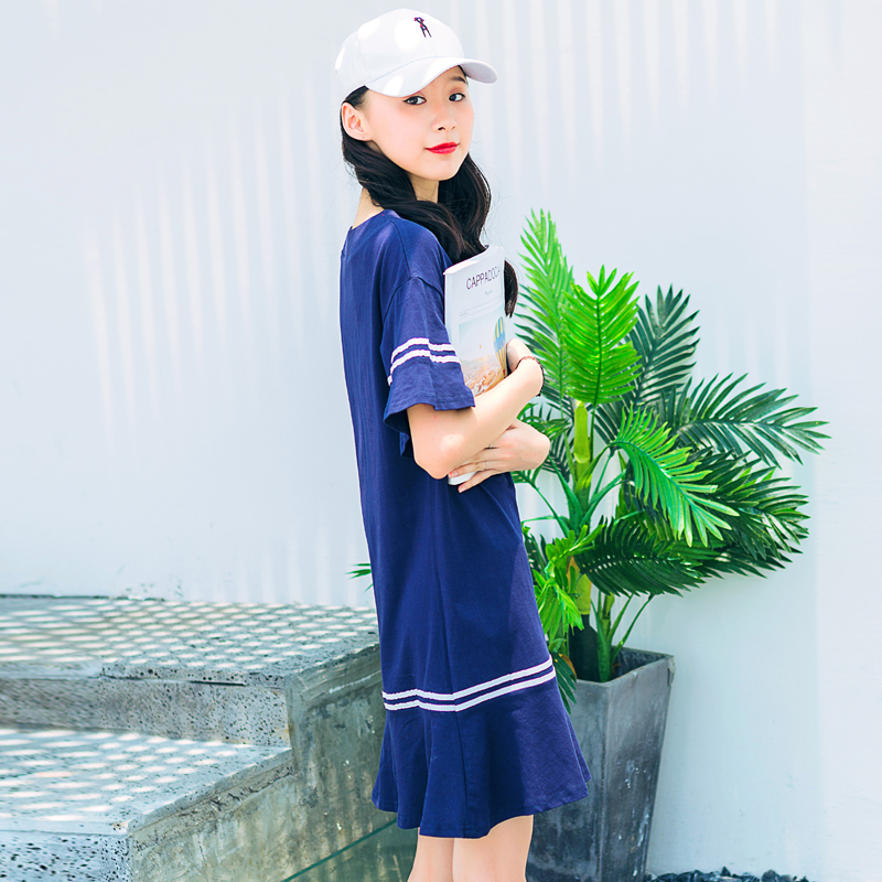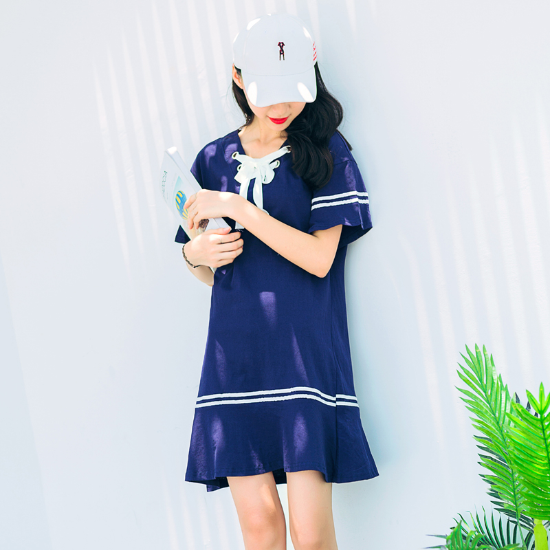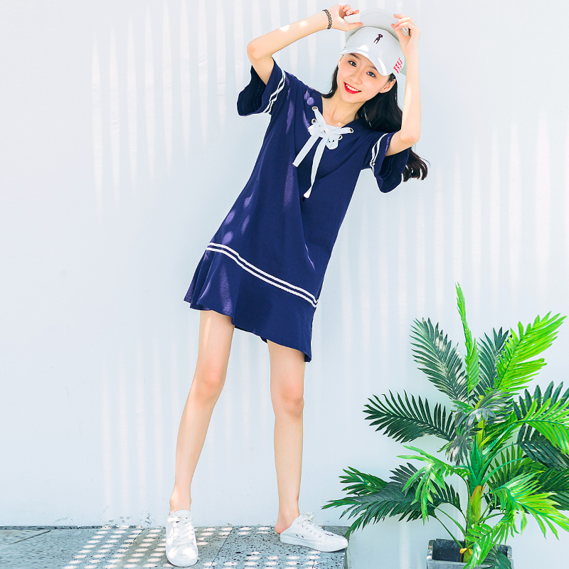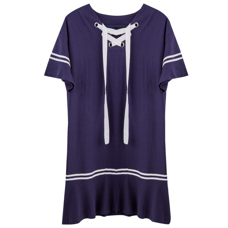 V領系帶喇叭短袖T恤連衣裙夏裝新款韓版寬松休閑中長款直筒