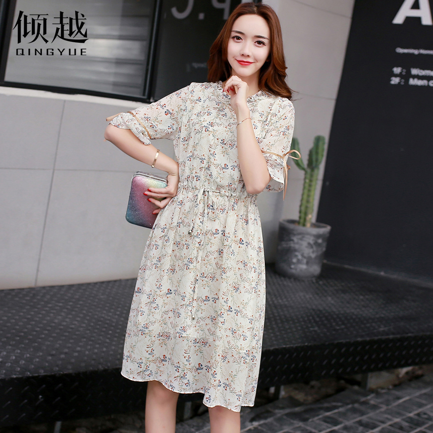 / 傾越2017新款春夏韓版小碎花雪紡連衣裙中長款顯瘦長袖圓領百褶裙