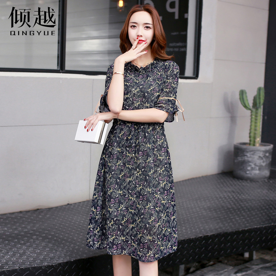 傾越2017新款春夏韓版小碎花雪紡連衣裙中長款顯瘦長袖圓領百褶裙