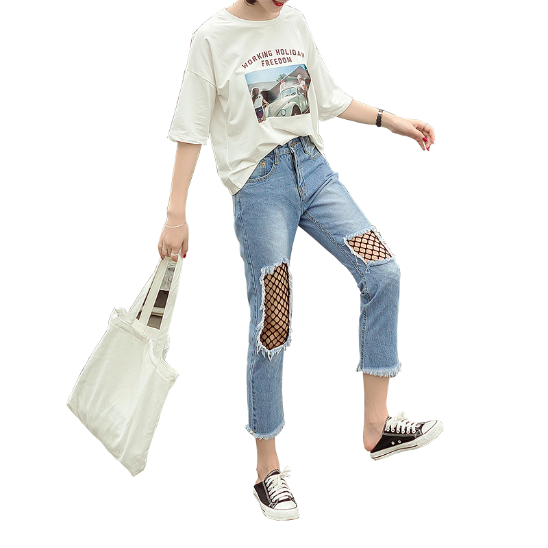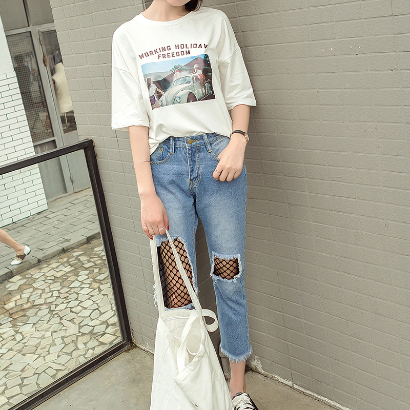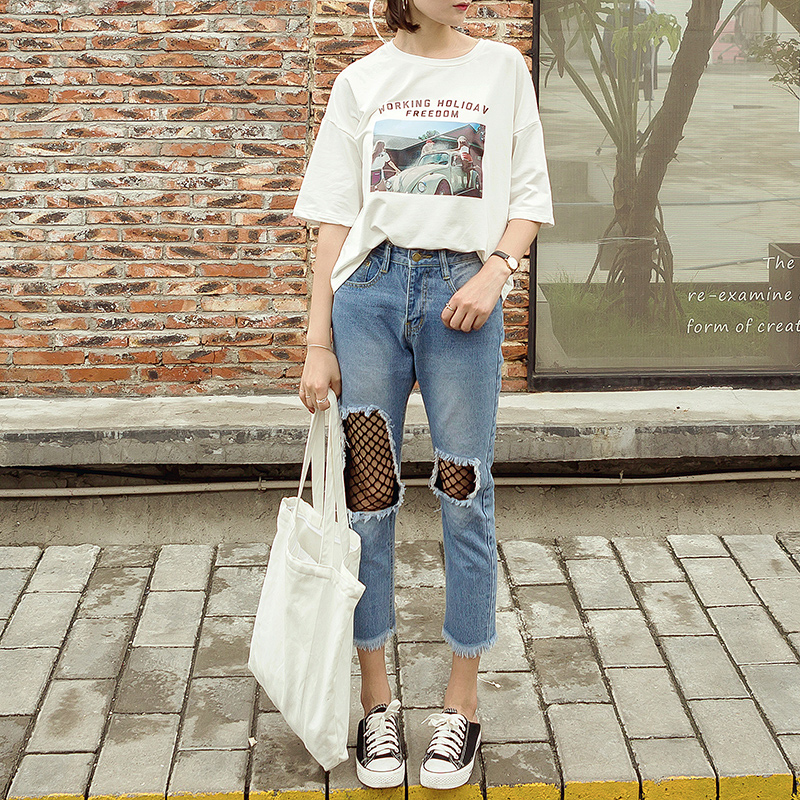 破洞處拼接的黑色漁網為整體注入嫵媚和不羈 搭配T恤,