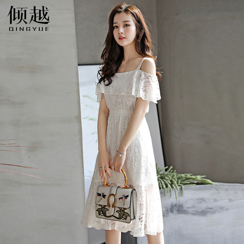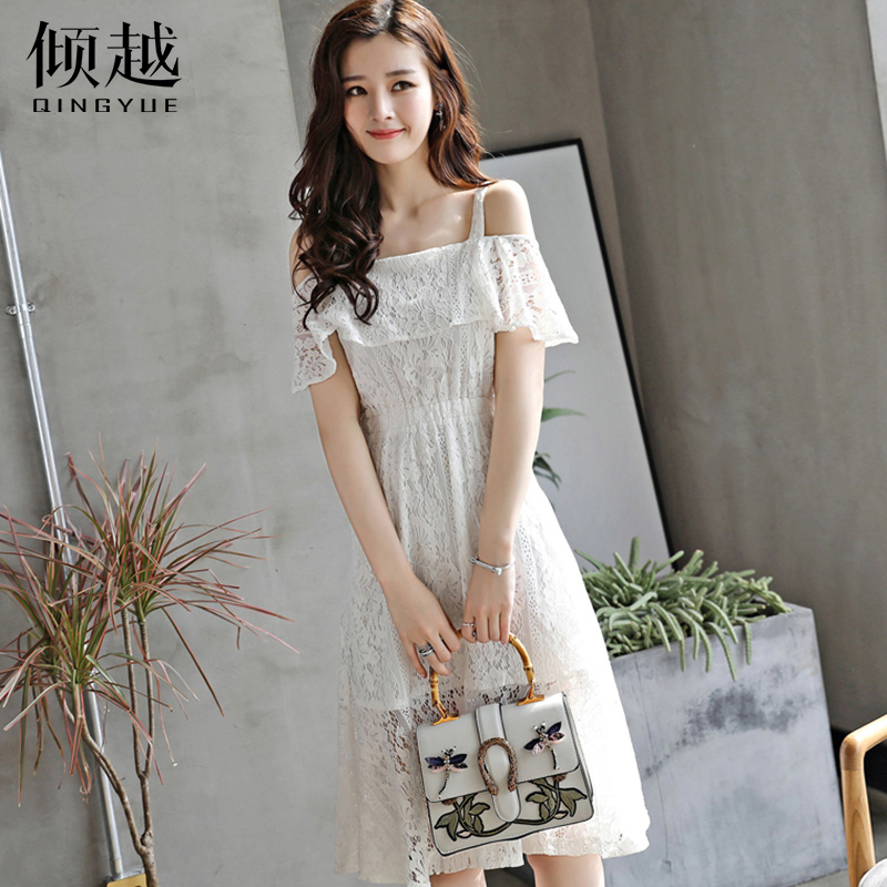 / 傾越2017夏季露肩吊帶蕾絲連衣裙波西米亞中長款小白裙顯瘦A字裙