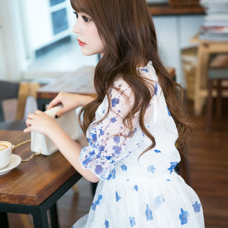 / 新款夏季雪紡韓版印花中長款修身碎花中袖蓬蓬時尚連衣裙女裝