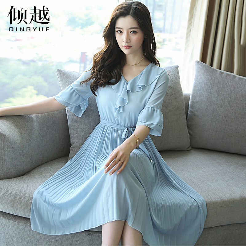雪紡連衣裙夏短袖2017新款韓版氣質修身顯瘦收腰中長款百褶裙子潮