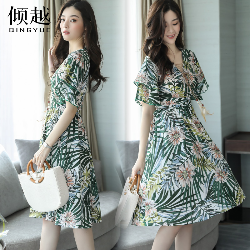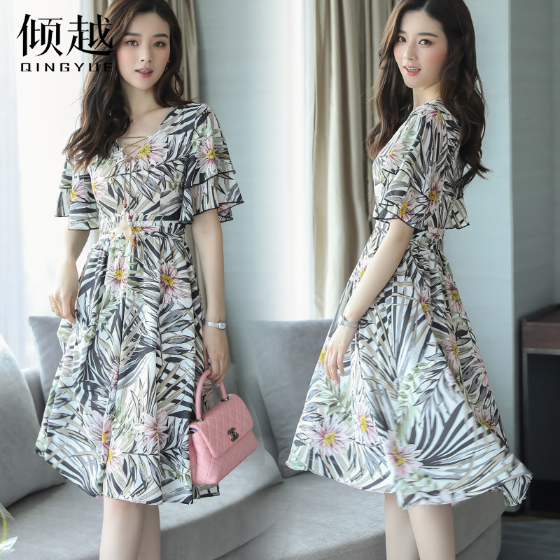 2017夏季新款韓版時尚氣質印花大擺裙女顯瘦中長款V領雪紡連衣裙
