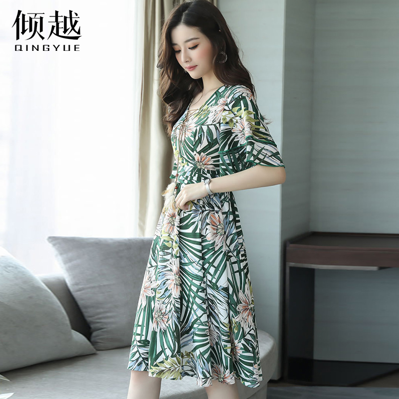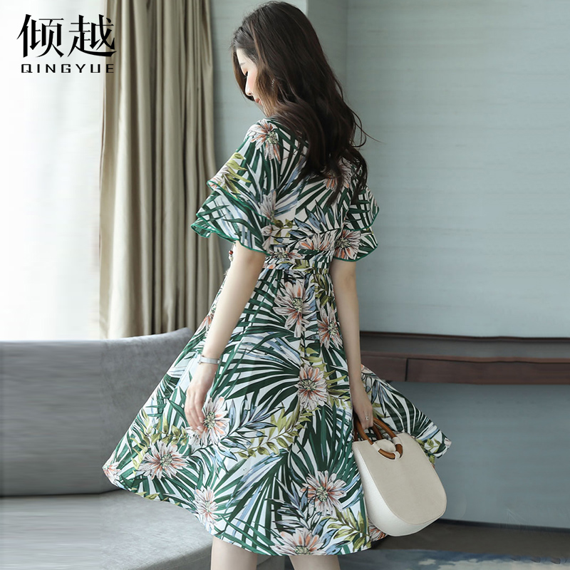 / 2017夏季新款韓版時尚氣質印花大擺裙女顯瘦中長款V領雪紡連衣裙