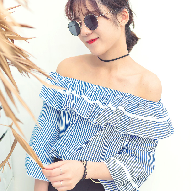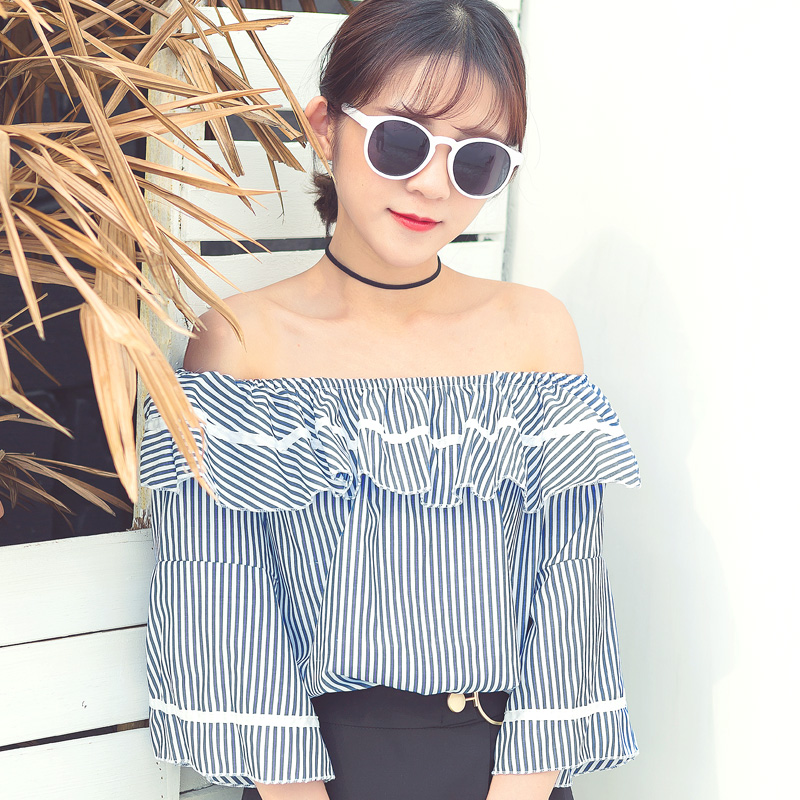 / 夏裝新款韓版女裝一字領漏肩襯衫喇叭袖荷葉邊條紋襯衣上衣潮