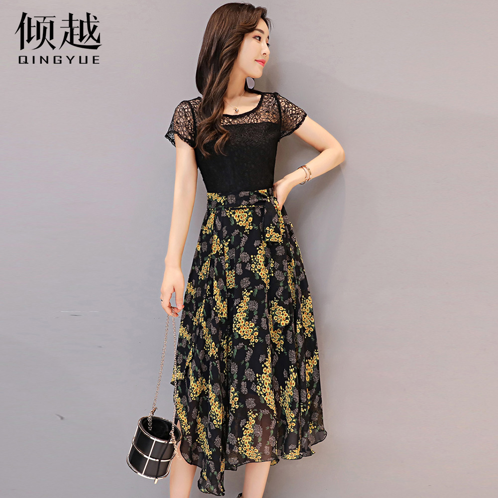 蕾絲連衣裙夏季2017新款女裝修身小清新氣質碎花雪紡中長a字裙子