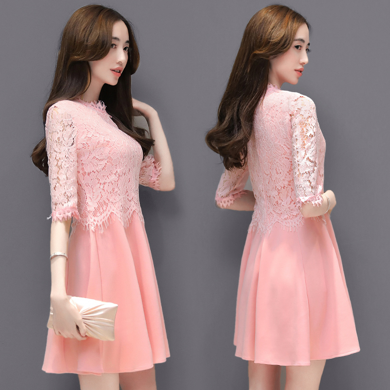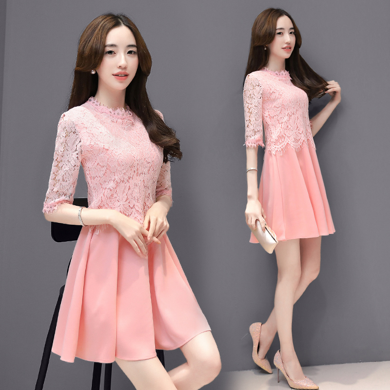 / 春季新款中裙五分袖蕾絲薄款時尚修身顯瘦假兩件打底連衣裙女