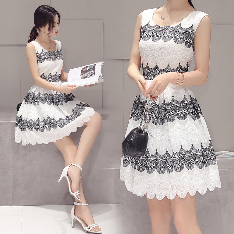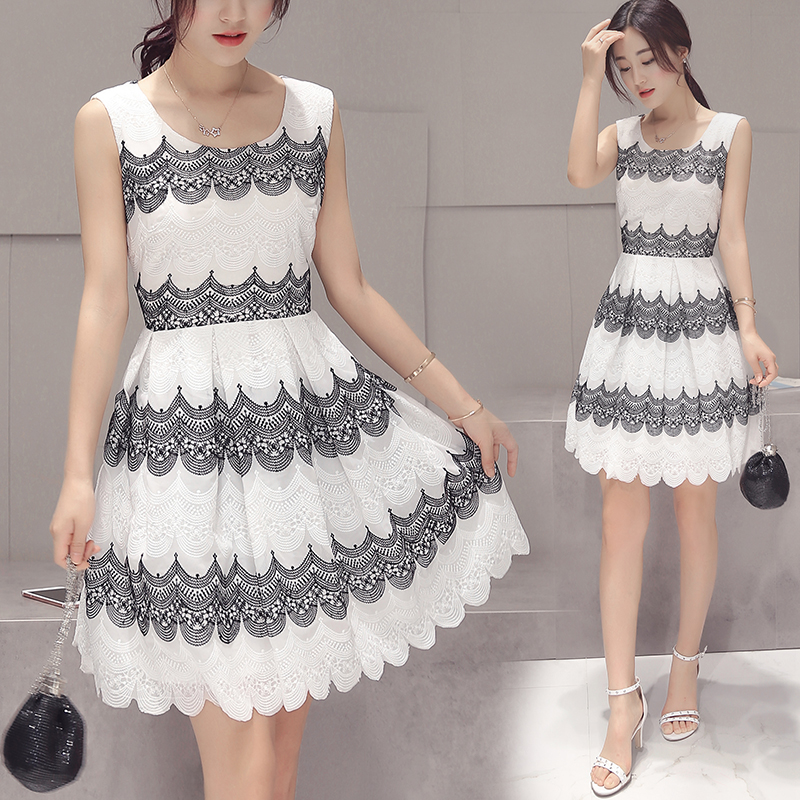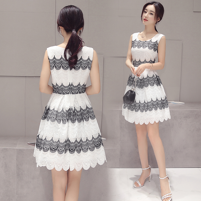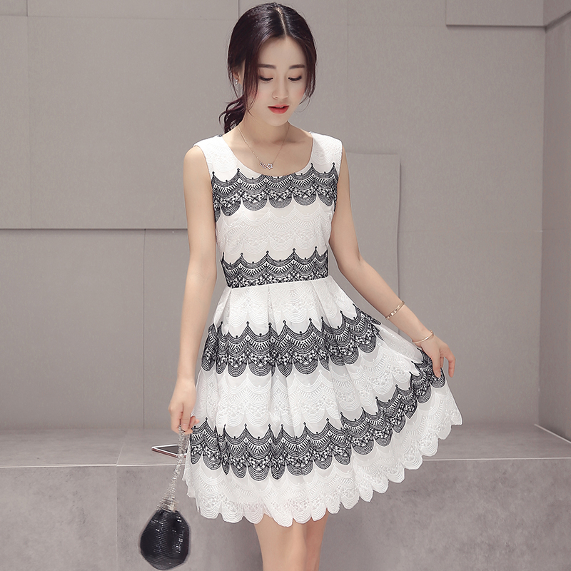 夏季新款蕾絲拼接韓版時尚小清新淑女連衣裙氣質A字裙短裙女