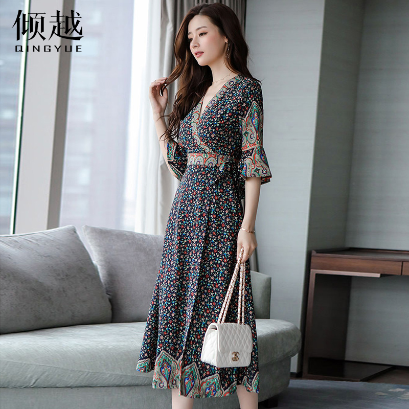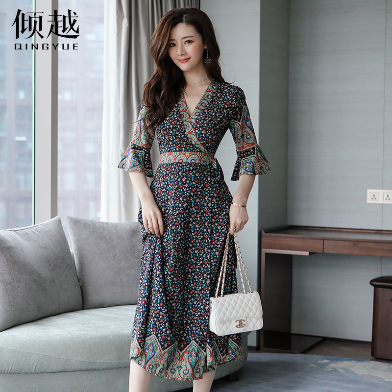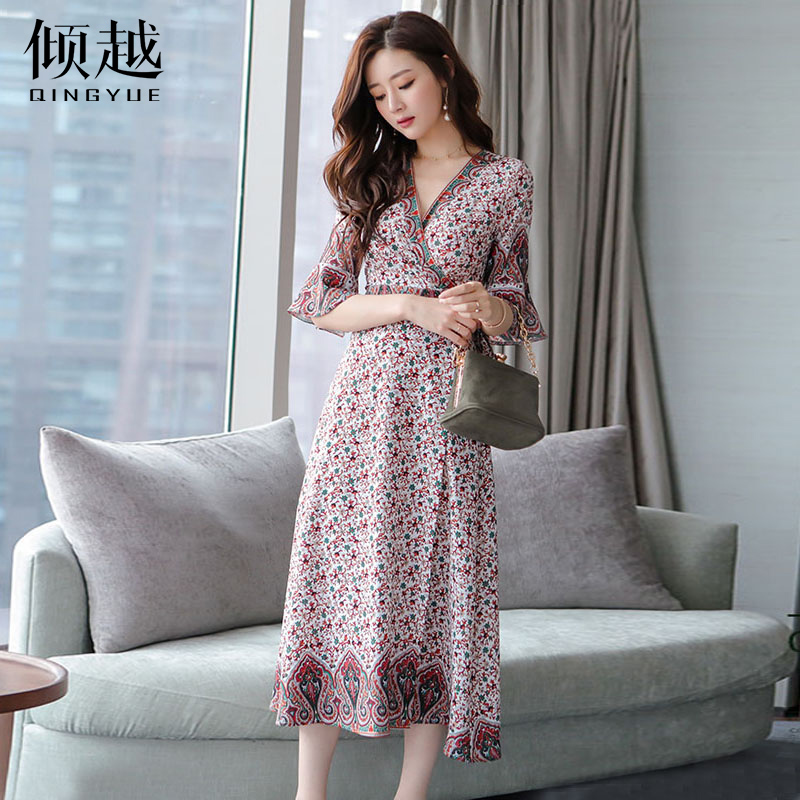 / 復古小碎花雪紡連衣裙女夏季喇叭袖V領修身海邊度假長裙2017新款