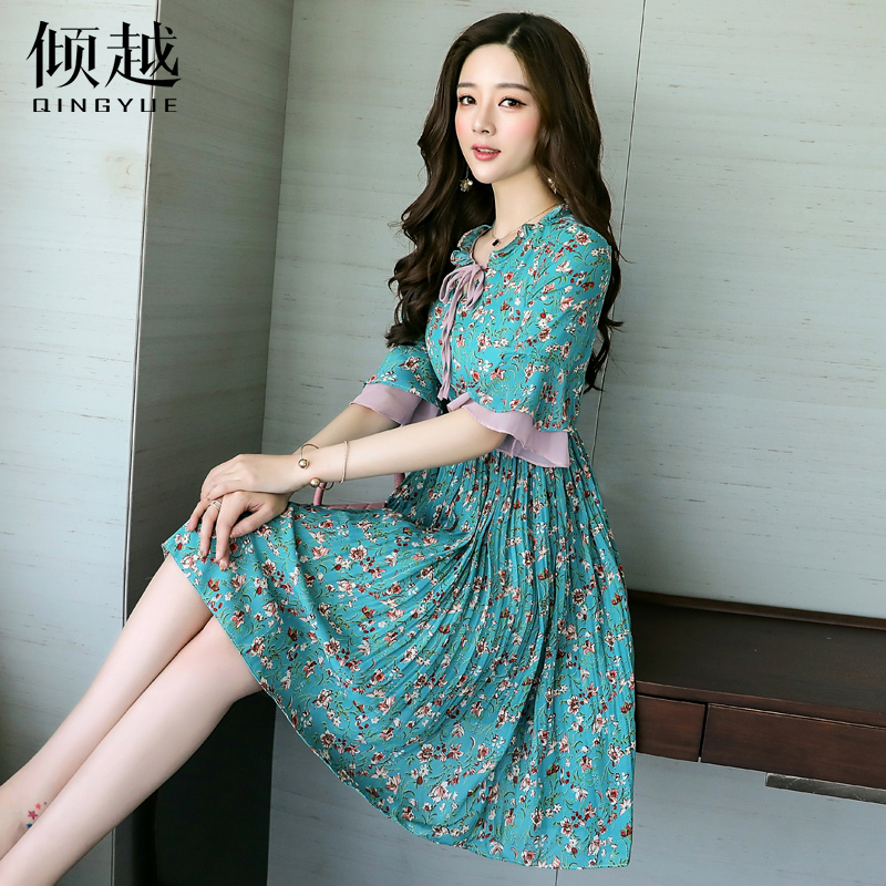 / 2017甜美小清新淑女雪紡連衣裙韓版碎花松緊腰荷葉袖修身百褶裙夏