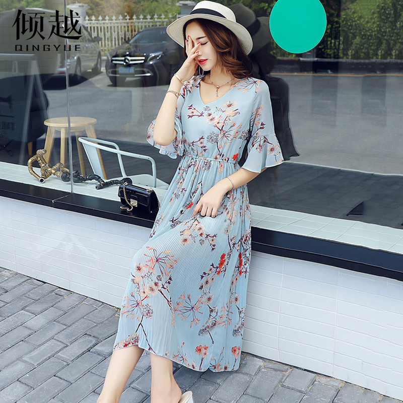 / 2017夏季新款女裝韓版氣質V領喇叭袖雪紡裙大擺碎花長裙連衣裙女