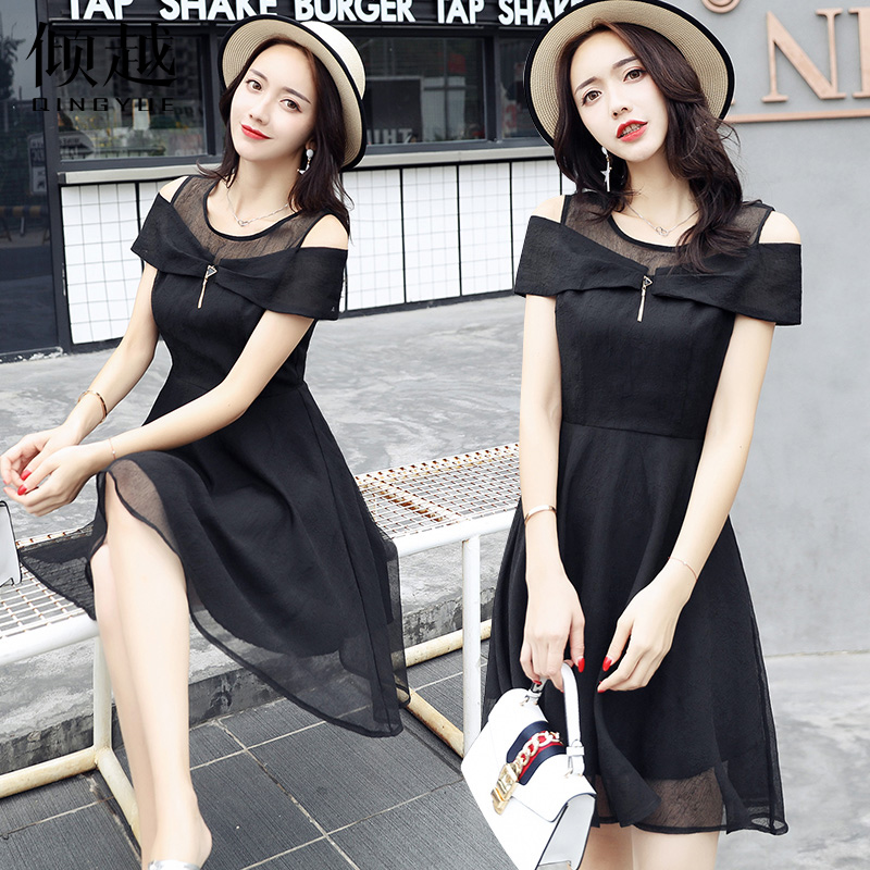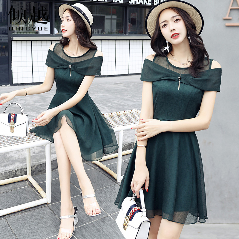 / 2017新款夏季雪紡連衣裙女中長款漏肩收腰顯瘦裙子時尚修身A字裙