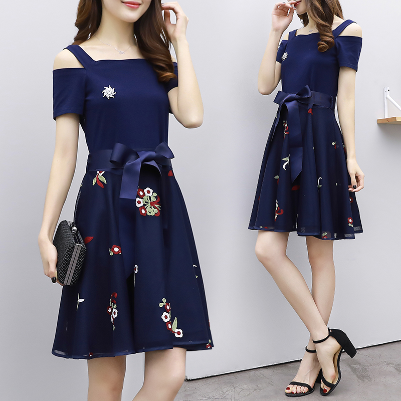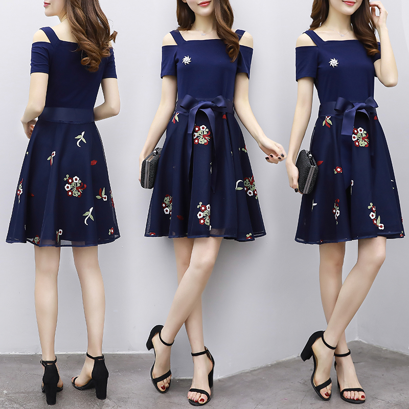 / 短袖露肩網紗針織連衣裙2017夏季女士韓版一字領繡花中長裙A字裙