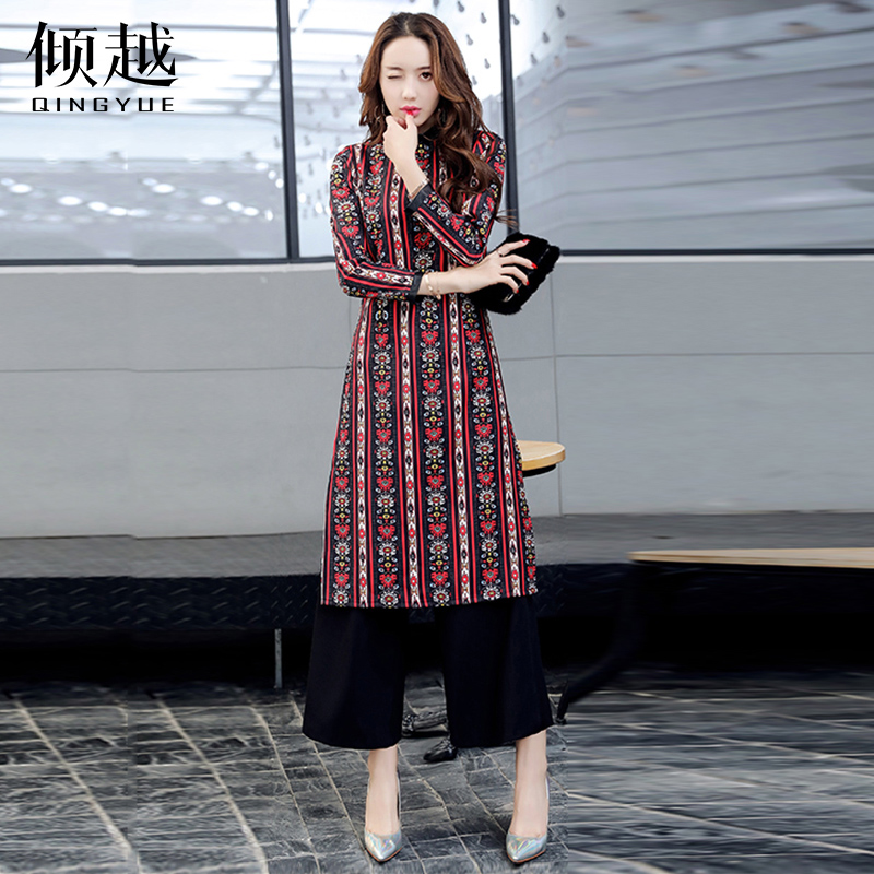 / 傾越2017春裝新款民族風女裝連衣裙中長裙套裝闊腿褲春秋長袖修身