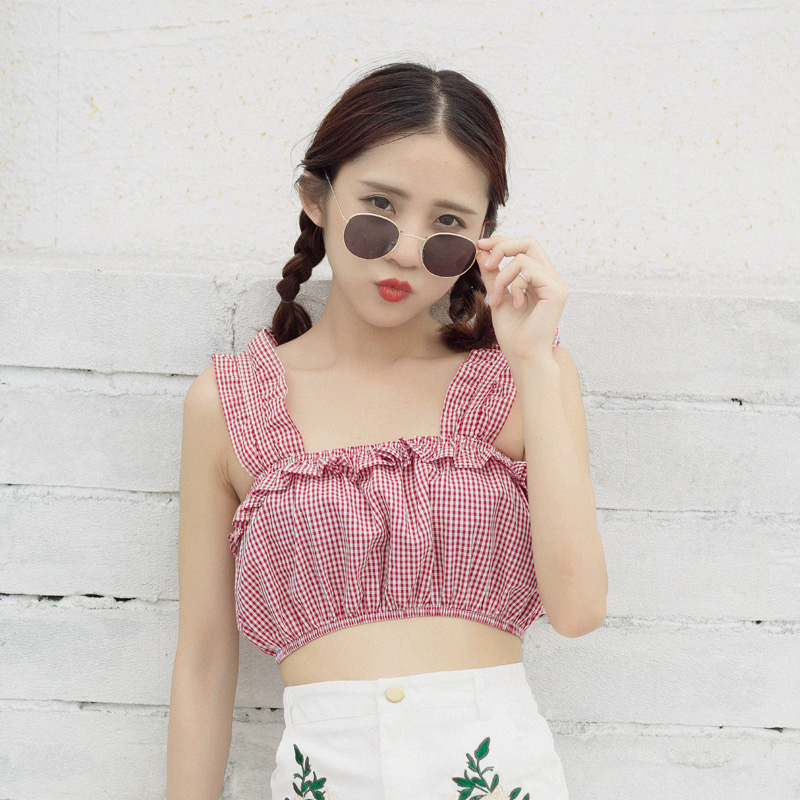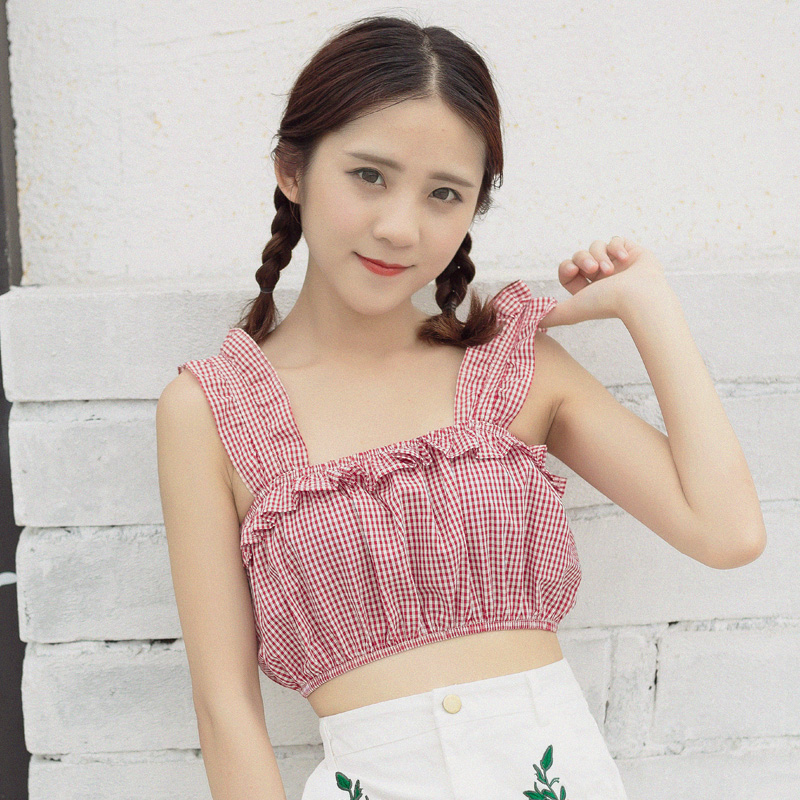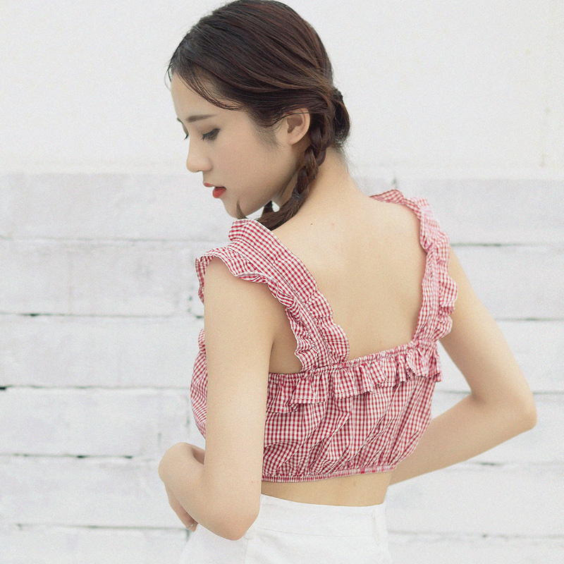 / 夏季復古韓國少女純色內搭抹胸式松緊褶皺荷葉邊吊帶打底背心