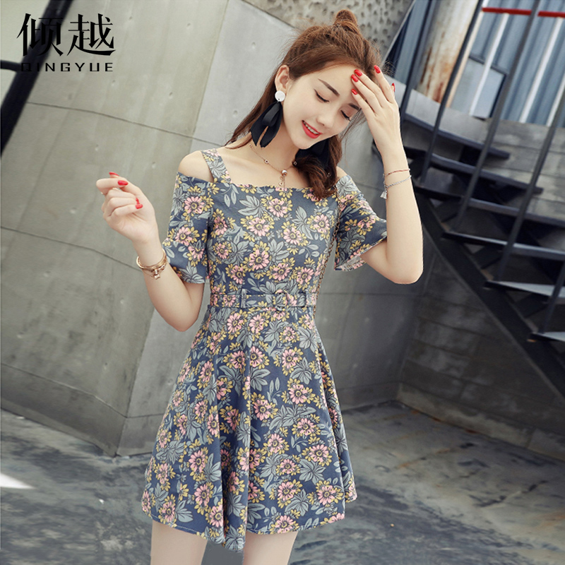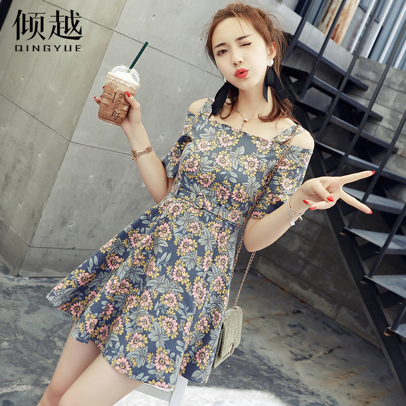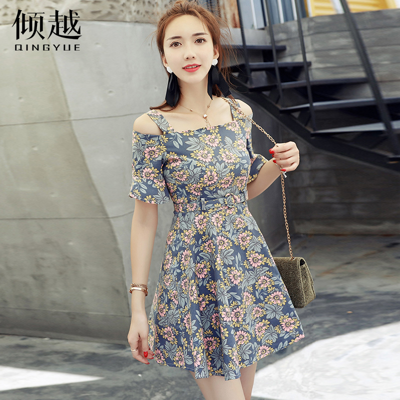 2017雪紡連衣裙中長款夏季新款收腰女裝韓版漏肩碎花短袖長裙子潮