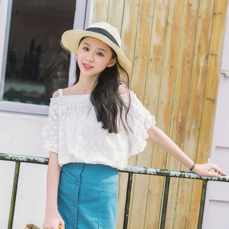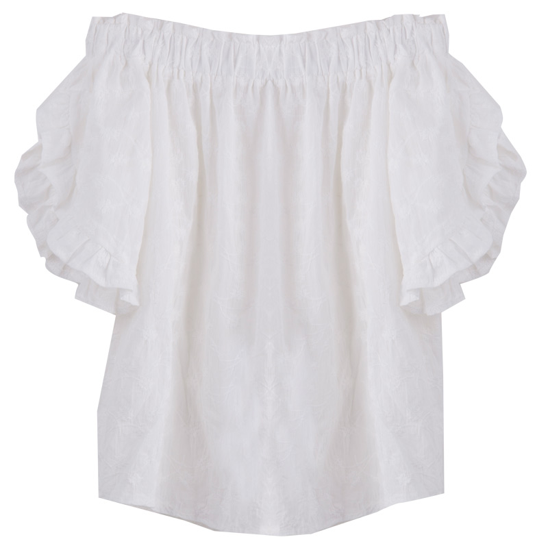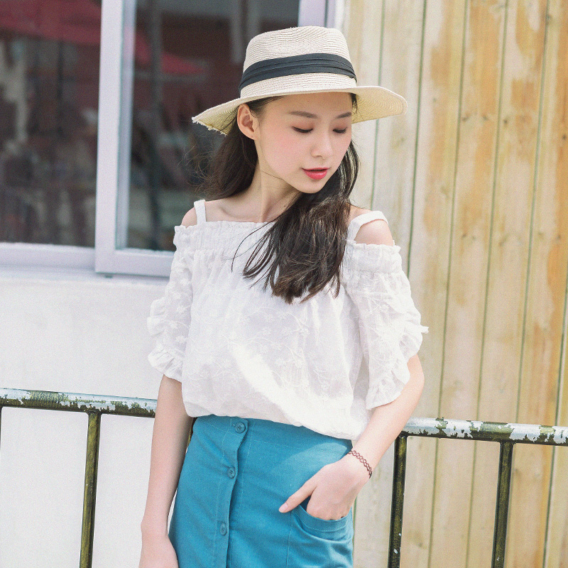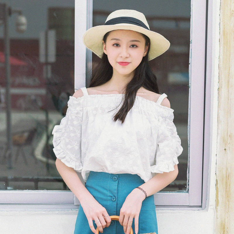/ 夏裝新款韓版女裝一字領露肩襯衫半袖木耳邊百搭白色襯衣上衣