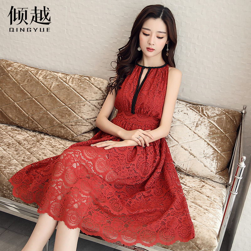 / 蕾絲連衣裙女夏長裙2017新款女裝韓版圓領無袖收腰顯瘦鏤空裙子潮