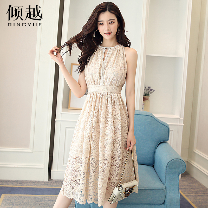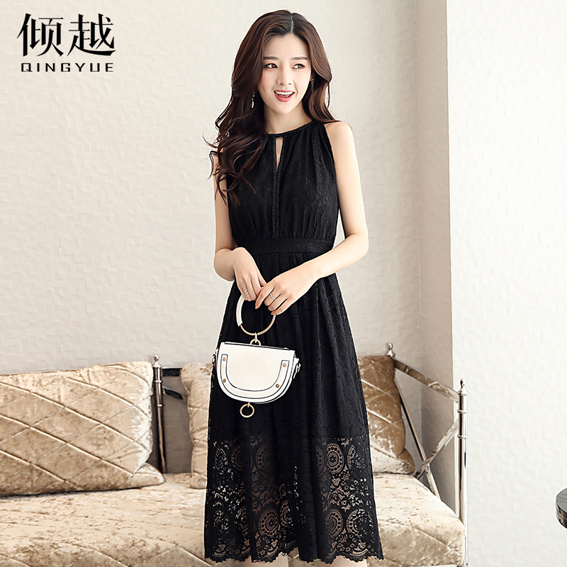 蕾絲連衣裙女夏長裙2017新款女裝韓版圓領無袖收腰顯瘦鏤空裙子潮