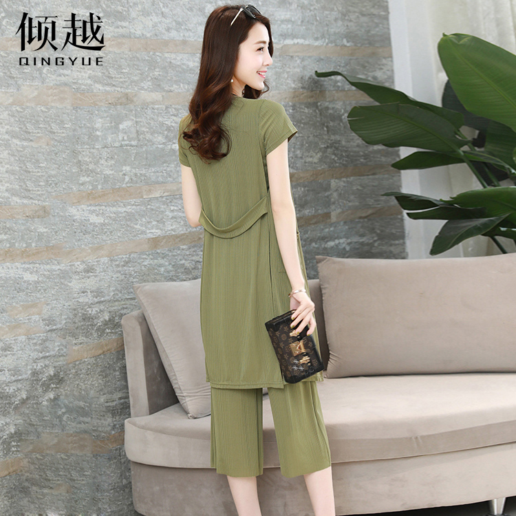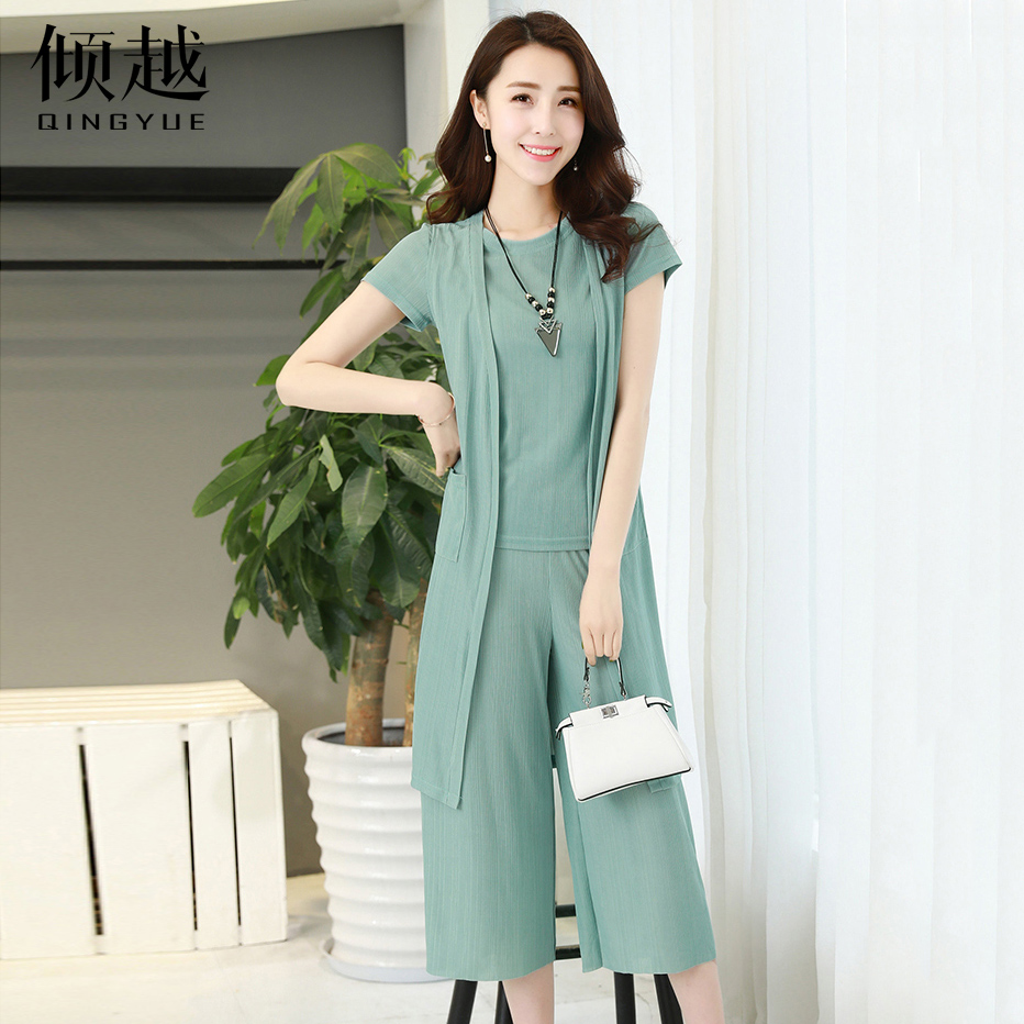 傾越2017新款夏裝氣質闊腿褲套裝復古女裝時尚三件套氣質七分褲潮