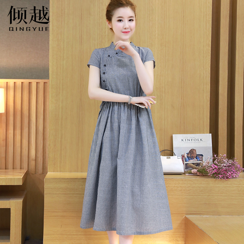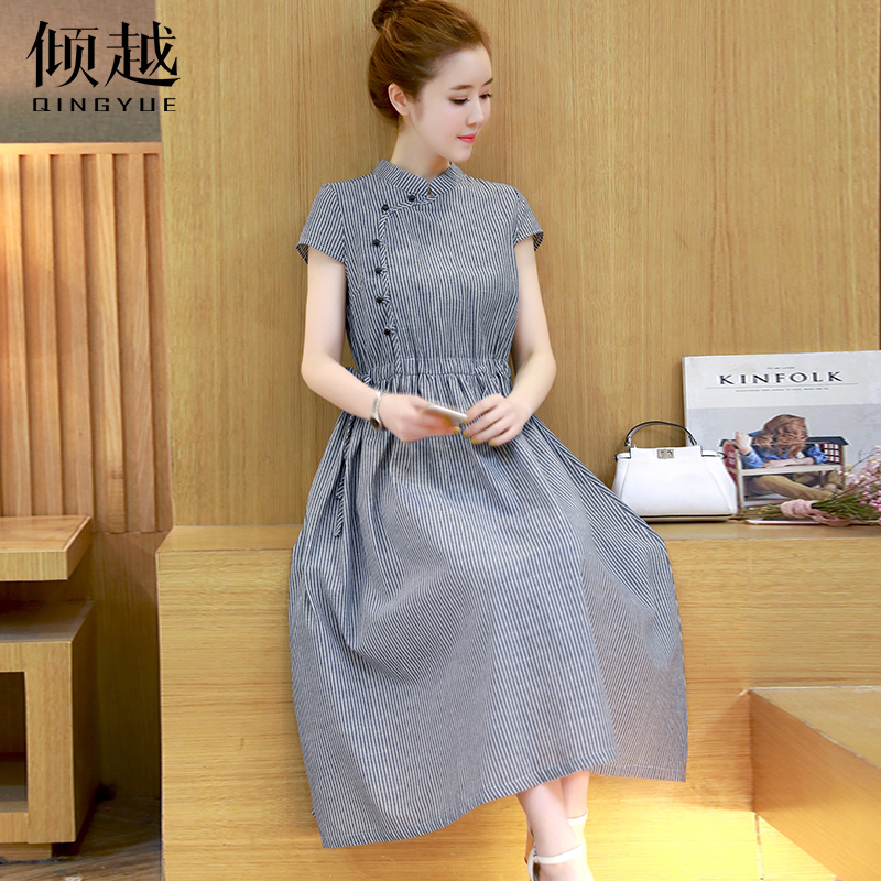 / 2017夏季新款大碼女裝條紋百搭連衣裙修身氣質中長款旗袍長裙子潮